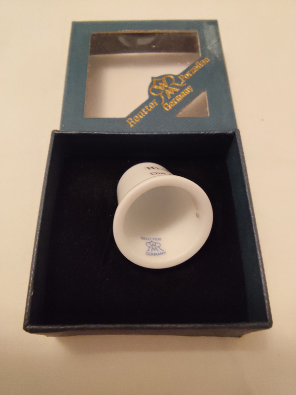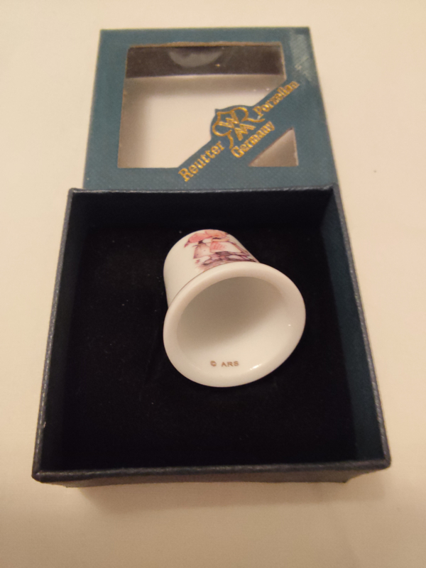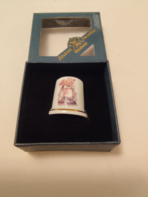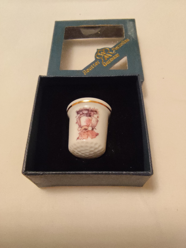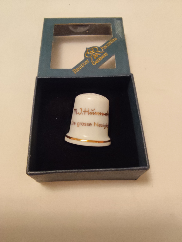 OverzichtOud porceleinen vingerhoed, Hummel serie gemaakt door Reuter porcelein in Duitsland uit 2008. Titel van het vingerhoedje is "Die grosse Neuigkeit". De maat is 2,5cm hoog en de diameter is 2,7cm.