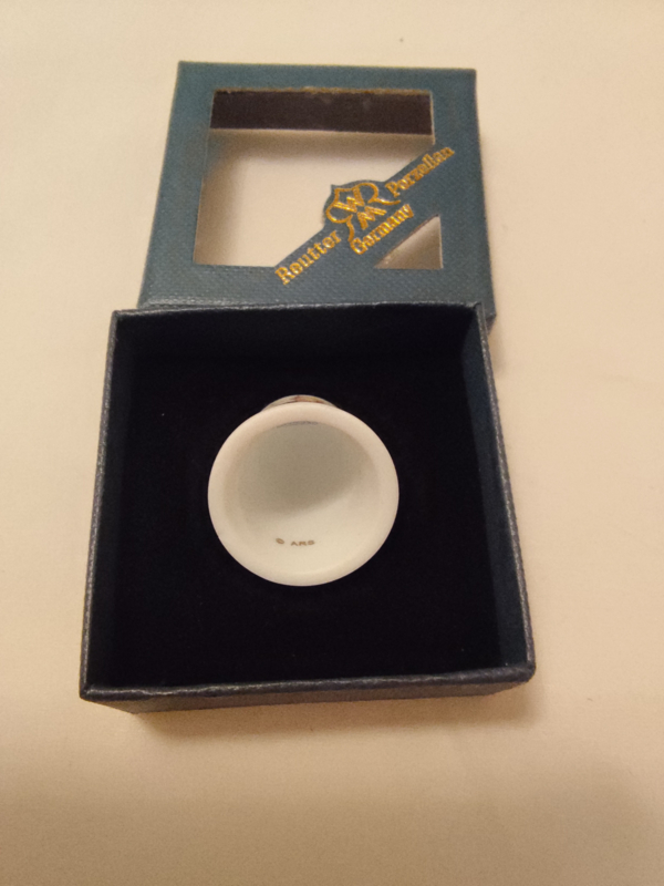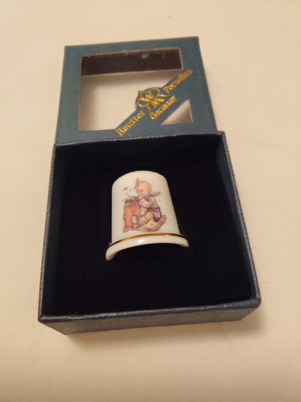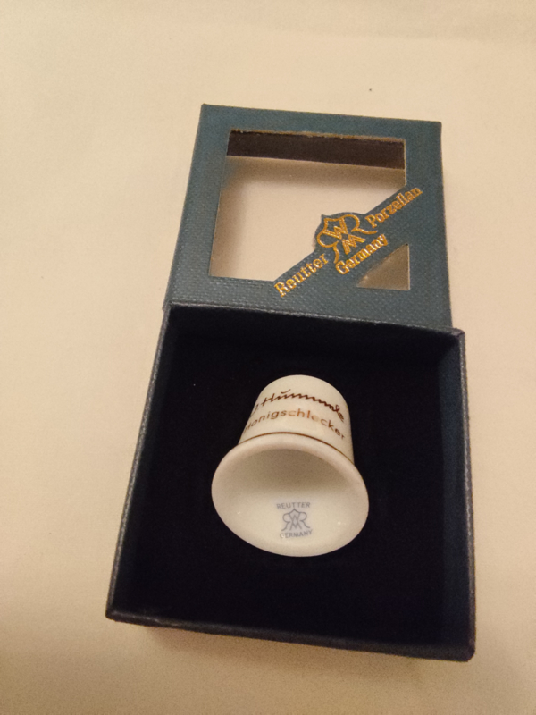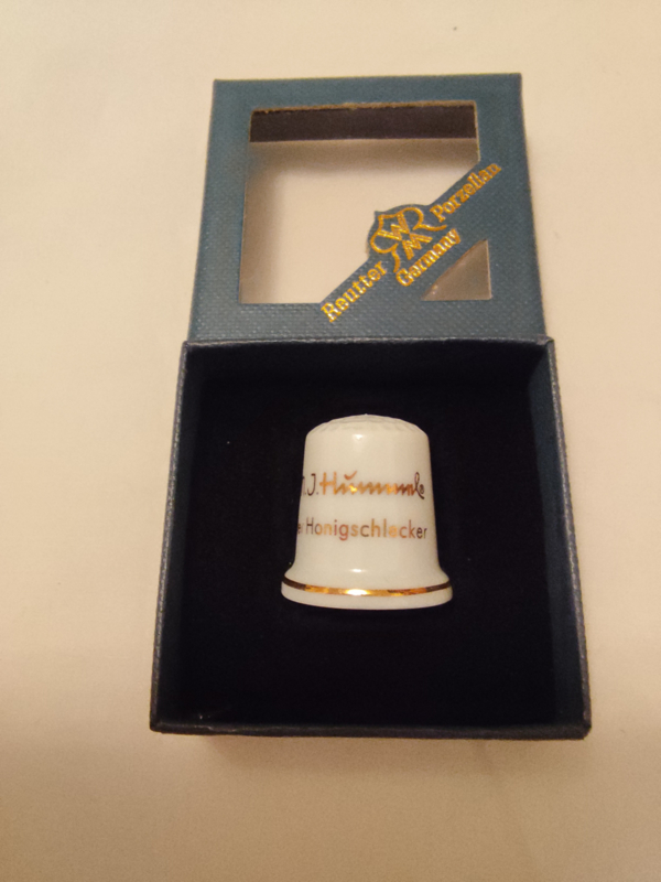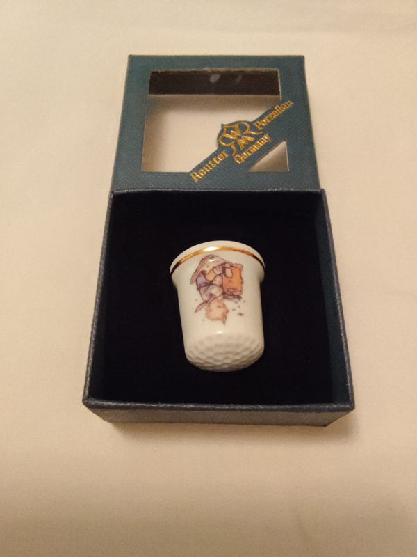 OverzichtOud porceleinen vingerhoed, Hummel serie gemaakt door Reuter porcelein in Duitsland uit 2007. Titel van het vingerhoedje is "Der Honigschlenker". De maat is 2,5cm hoog en de diameter is 2,7cm.