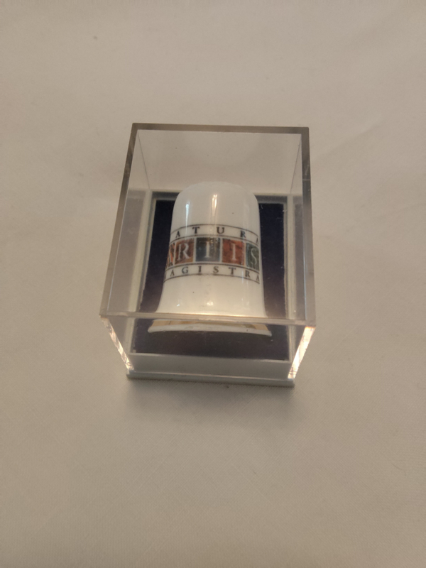 OverzichtOud porceleinen (fine Bone China) vingerhoed, opdruk of opschrift Art Magistra en geen inscriptie. De maat is 3cm hoog en de diameter is 2,4cm.