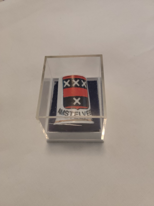 OverzichtOud porceleinen (fine Bone China) vingerhoed, opschrift Amstelveen en Birchcroft made in Great Britain. De maat is 3cm hoog en de diameter is 2,4cm.