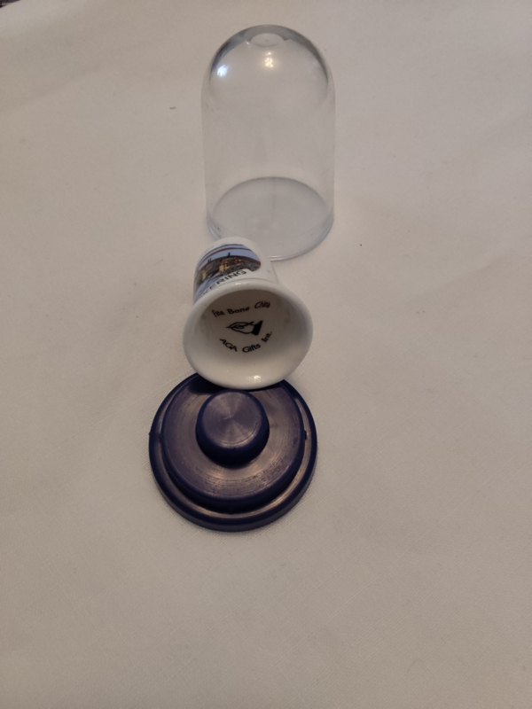 OverzichtOud porceleinen (fine Bone China) vingerhoed, opdruk of opschrift Stormvloedkering en inscriptie Fine Bone China AGA gifts int.. De maat is 3cm hoog en de diameter is 2,4cm.