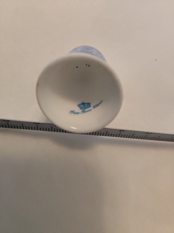 OverzichtOud porceleinen (fine Bone China) vingerhoed, opdruk of opschrift Drentse fiets vierdaagse en inscriptie Fine Bone . De maat is 2,9cm hoog en de diameter is 2,4cm.
