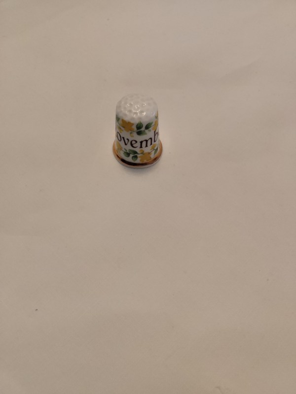 OverzichtOud porceleinen (fine Bone China) vingerhoed, opdruk of opschrift November en inscriptie aan de binnenkant Finsbury Fine Bone China made in England. De maat is 2,6cm hoog en de diameter is 2,3cm.