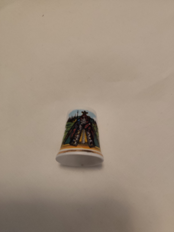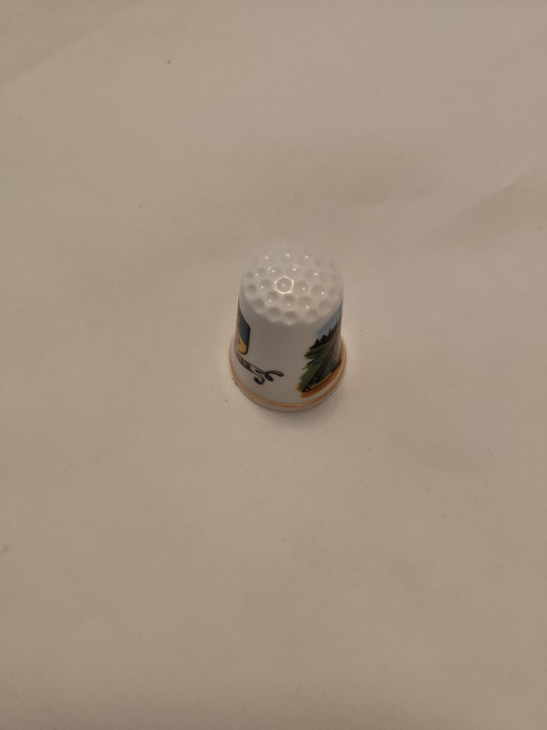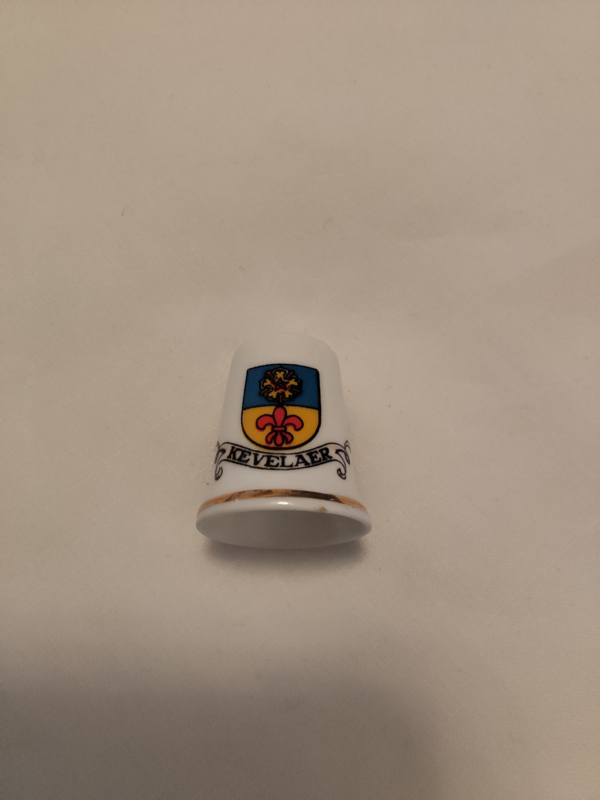 OverzichtOud porceleinen (fine Bone China) vingerhoed, opdruk of opschrift Kevelaer en geen inscriptie. Het vingerhoedje heeft aan 2 zijden een opdruk. De maat is 3cm hoog en de diameter is 2,4cm.