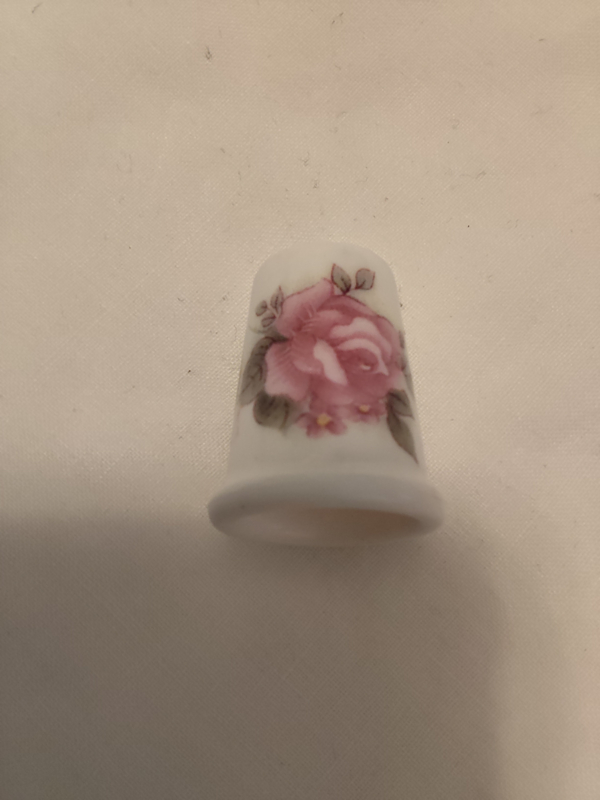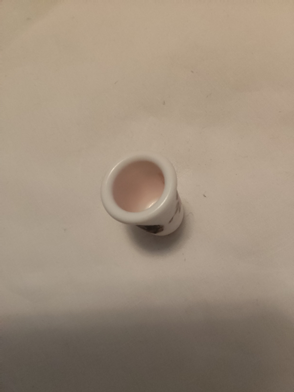 Oud porceleinen (fine Bone China) vingerhoed, opdruk of opschrift Lourdes en een 2-zijdige opdruk en geen inscriptie. De maat is 3cm hoog en de diameter is 2,3cm.