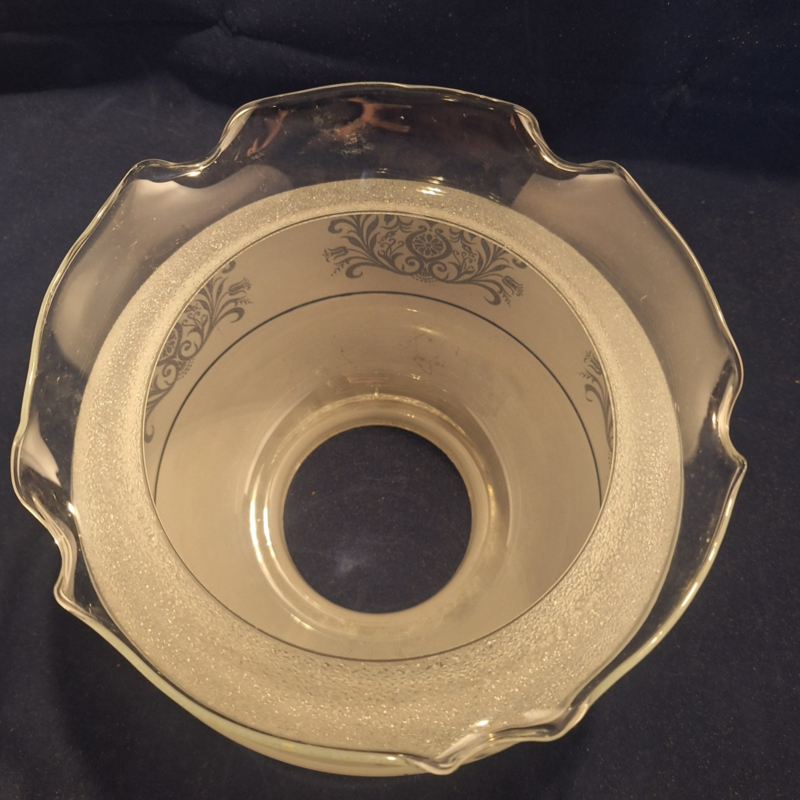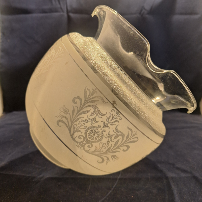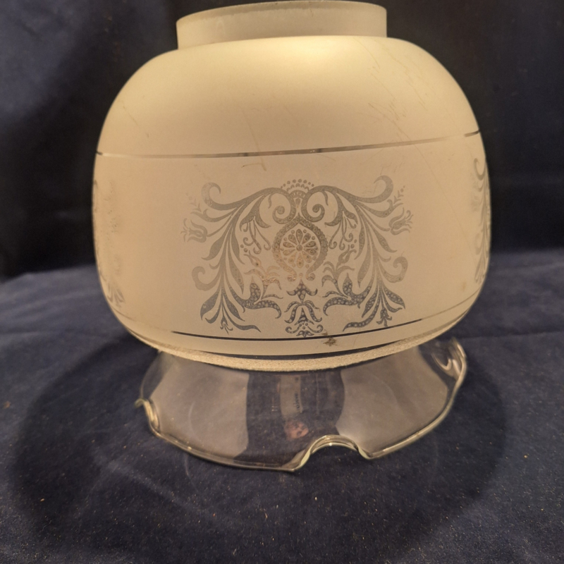 OverzichtOude originele olielamp kap met helder, gesatineerd en geetst glas met erin een motief. De heldere rand aan de bovenkant heeft een "rokje". De maten van deze bolvormige victoriaanse stijl olielamp kap zijn hoog - 19cm en diameter - 19cm. De opstaande rand die in de kraag van de lamp valkt is 9,9cm.