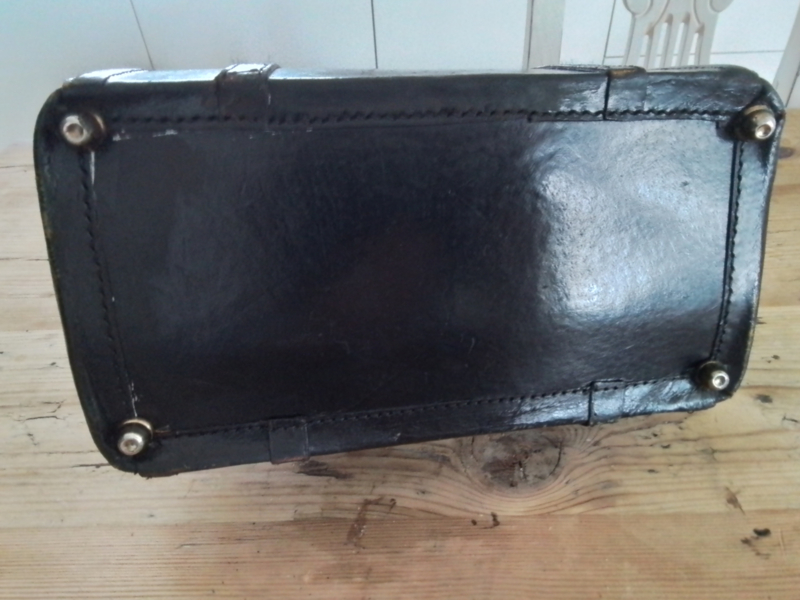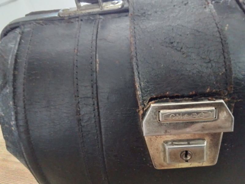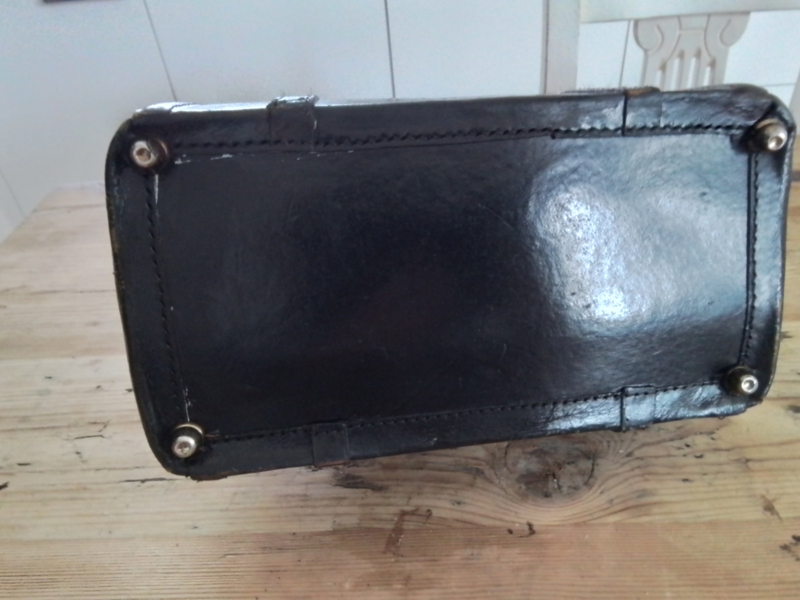 OverzichtDonkerbruin leren tasje Stamt uit ongeveer 1950 /1070. De sluiting is een overslagslot of een kofferset uit de vorige eeuw. Op het slot staat CNABC. Bovenkant slotje is door riempje gekerfd. ZIE FOTO. Kan aan achterkant verstevigd worden, Het tasje of koffertje is zeer decoratief om ergens neer te zetten. Hoog 22cm en breed 30cm.