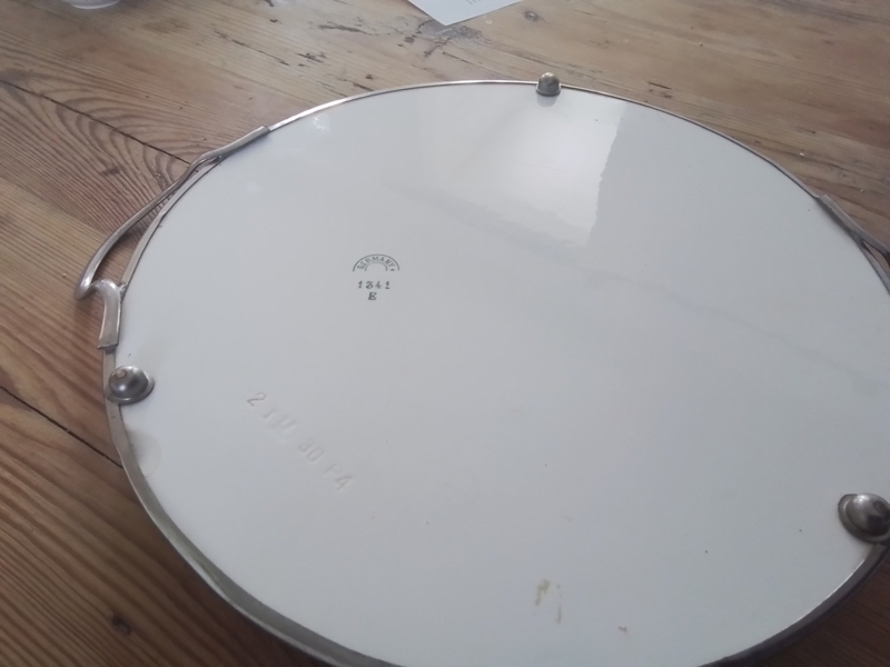 Art deco taartplateau met metalen zilverkleurige rand. Met tinten groen, geel en bruin.