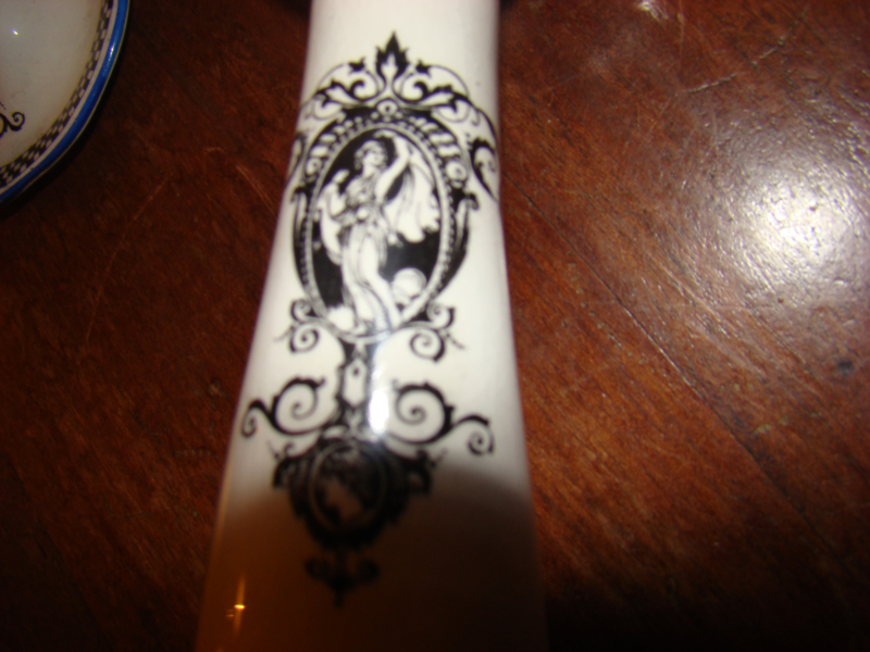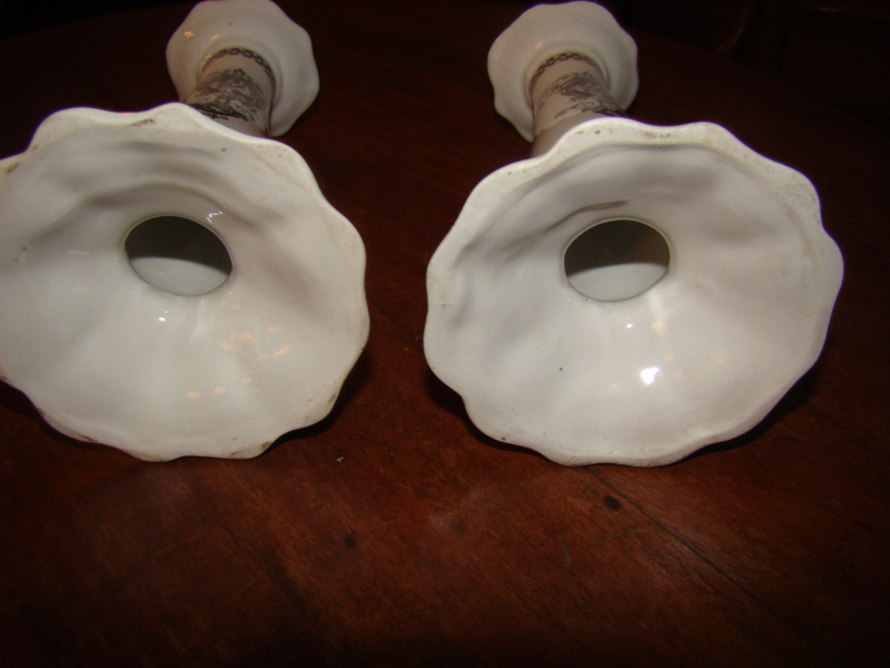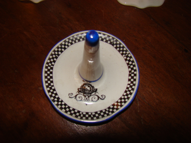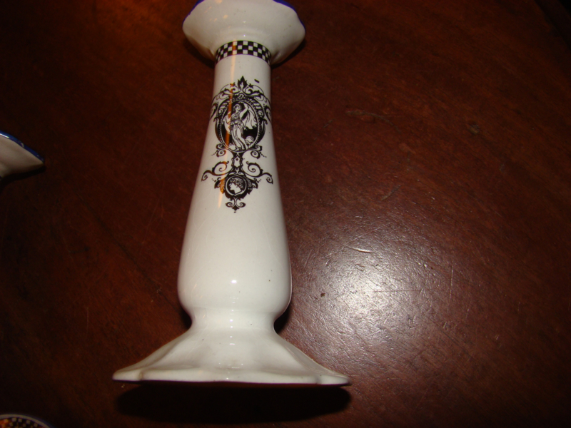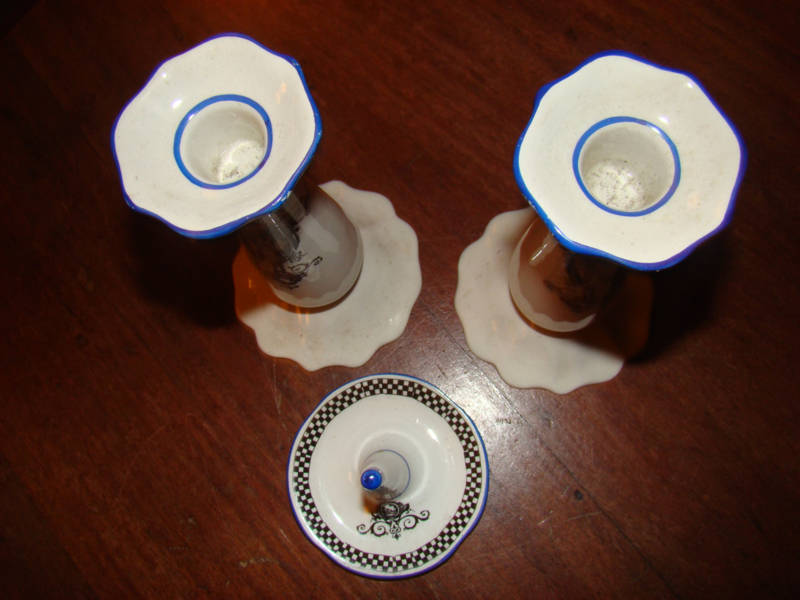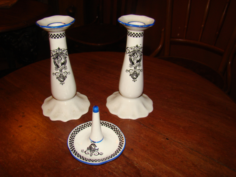 zwarte motieven en donkerblauw randje. Topje van ringenhouder is ook blauw. Hoogte kandelaars 10cm en doorsnede onderkant kandelaars 9cm. Prijs is voor kandelaars en ringenstandaard