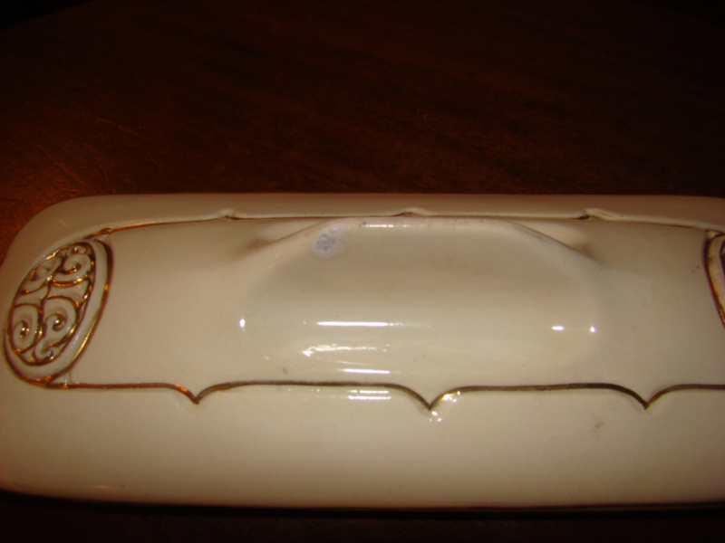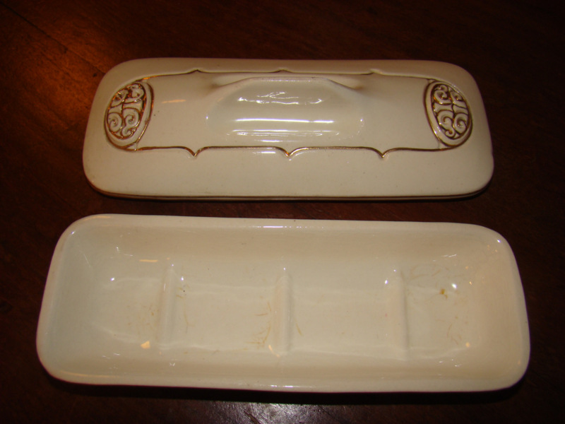 OverzichtArt deco kammenbak.Fraaie vorm, 8cm breed,lengte 21,5cm. Lengte deksel 23cm, breed 10cm. Kleine beschadiging handvat deksel en chipje aan onderkant.Niet storend. zie foto's.