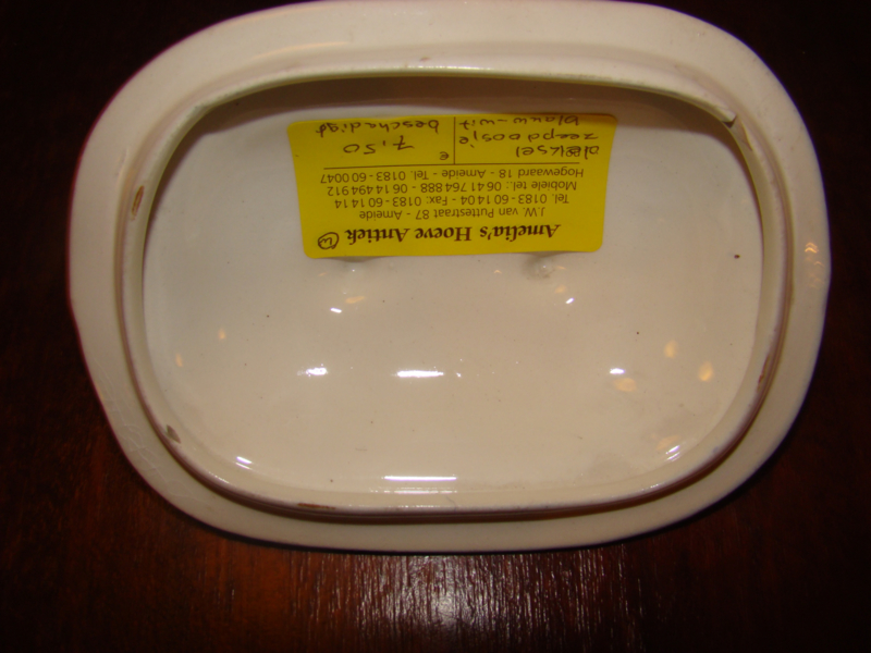OverzichtLos deksel voor een zeepbakje wit-blauw. Binnenrand past in een zeepbakje van 12,5cm.Kleine chipjes van onderkant. zie foto.