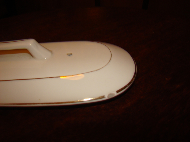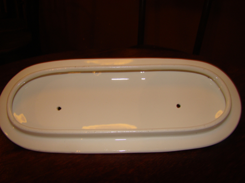 OverzichtLos wit deksel met gouden biesje voor een kammenbakje zonder deksel.Een heel klein chipje uit de rand. Zie foto.Totale lengte 23cm. De binnenrand zie foto 3 is 20cm. Breedte binnenrand 6,8cm. Totale breedte 9,5cm.Zou leuk zijn als iemand de onderbak heeft.