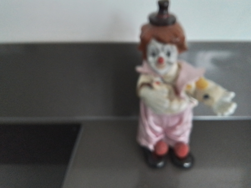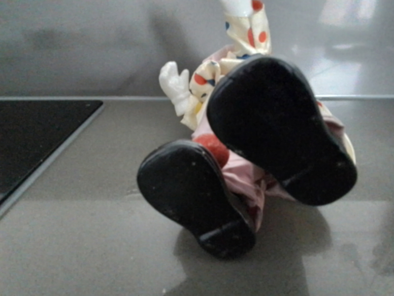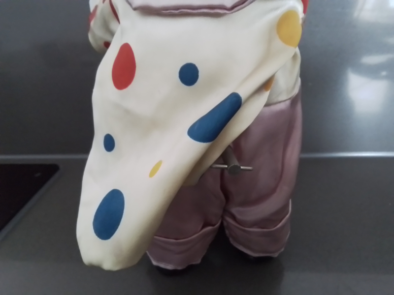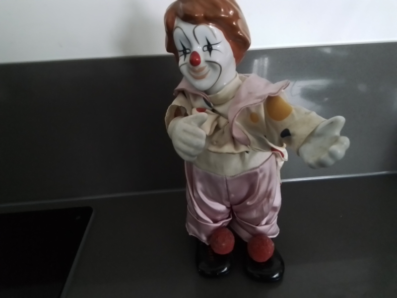 OverzichtBeweegbare clown met speeldoos. Bovenlijf beweegt zich van achter naar voren .Functioneert goed.Hoogte 29cm.