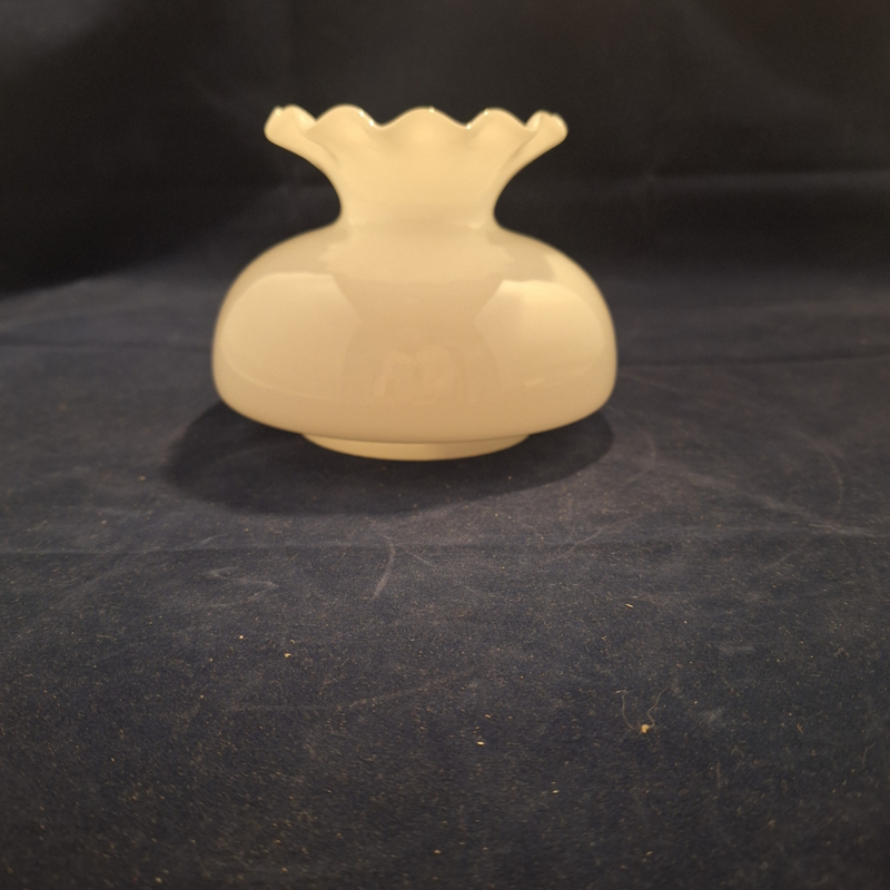 Olielamp kap klein model d-12,5cm rand 10,8cm opaal nr 10089Olielamp kapje klein model voor een tafellampje of wandlampje. De kleur van de glazen kap is opaal (glans) wit en de maten zijn hoog 12,2cm, diameter 12,5cm en de opstaande rand die in de kraag van de lamp valt is 10,8cm.