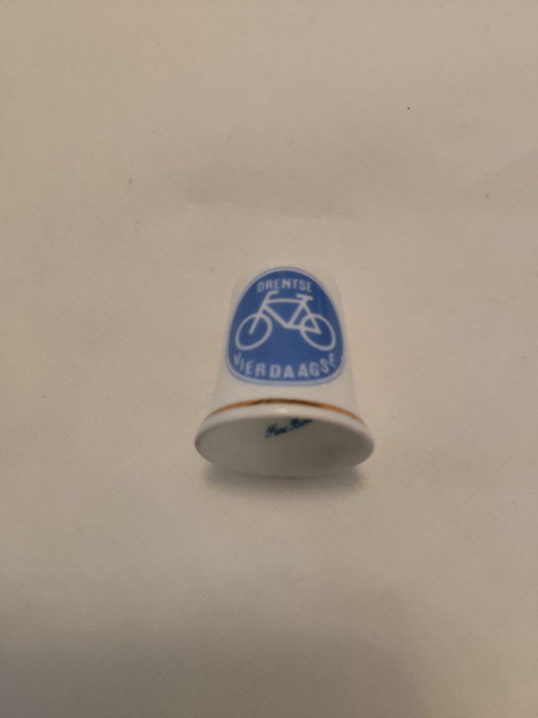 Vingerhoed porcelein opdruk Drentse fiets vierdaagse 2,9cm hoog inscriptie Fine Bone ChinaOud porceleinen (fine Bone China) vingerhoed, opdruk of opschrift Drentse fiets vierdaagse en inscriptie Fine Bone . De maat is 2,9cm hoog en de diameter is 2,4cm.