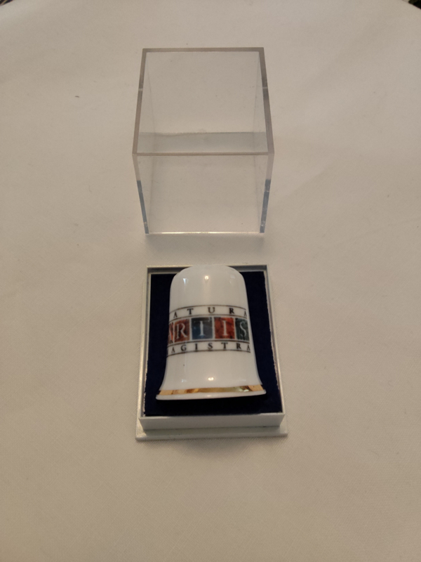 Vingerhoed porcelein opdruk Stormvloedkering 3cm hoog Fine Bone China AGA gifts int.Oud porceleinen (fine Bone China) vingerhoed, opdruk of opschrift Stormvloedkering en inscriptie Fine Bone China AGA gifts int.. De maat is 3cm hoog en de diameter is 2,4cm.