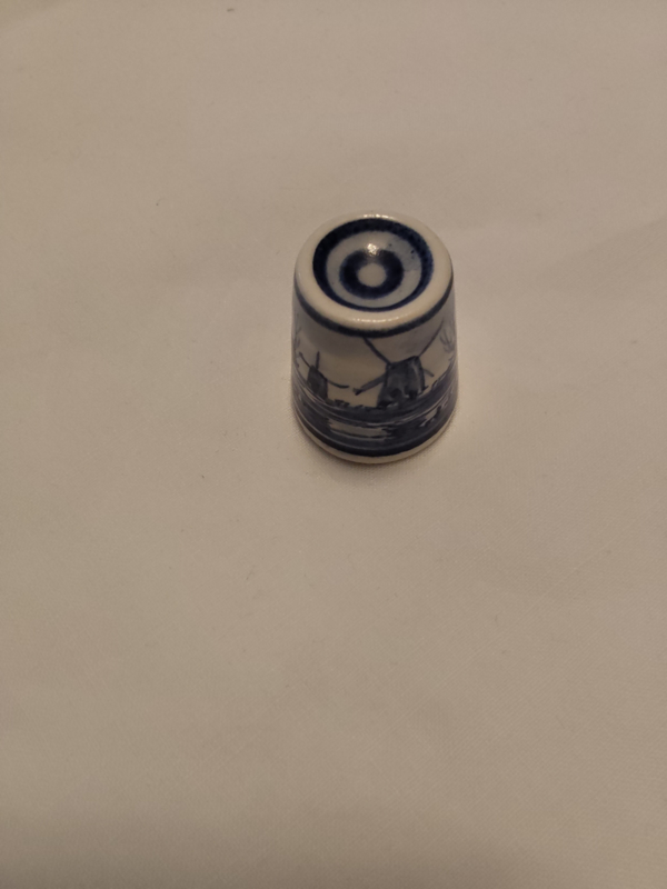 Vingerhoed porcelein Delft opdruk een typisch Hollands landschap 2,7cm hoog zonder doosjeOud porceleinen (fine Bone China) vingerhoed, opdruk of opschrift van een typisch Hollands landschap en inscriptie Delft. De maat is 2,7cm hoog en de diameter is 2,4cm.