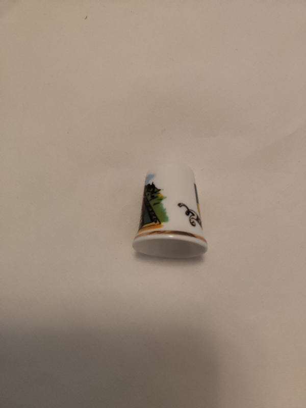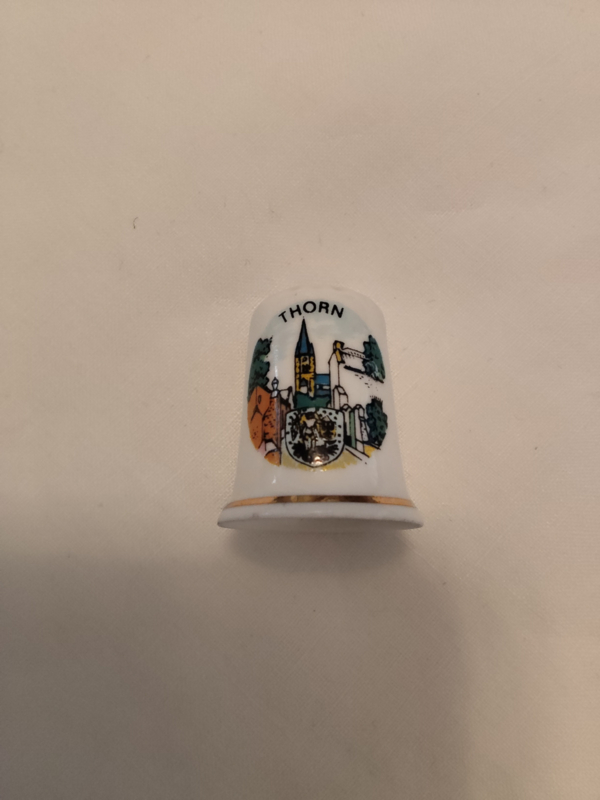 Vingerhoed porcelein opdruk Thorn 3cm hoog zonder doosjeOud porceleinen (fine Bone China) vingerhoed, opdruk of opschrift Thorn en inscriptie Fine Bone China. De maat is 3cm hoog en de diameter is 2,4cm.