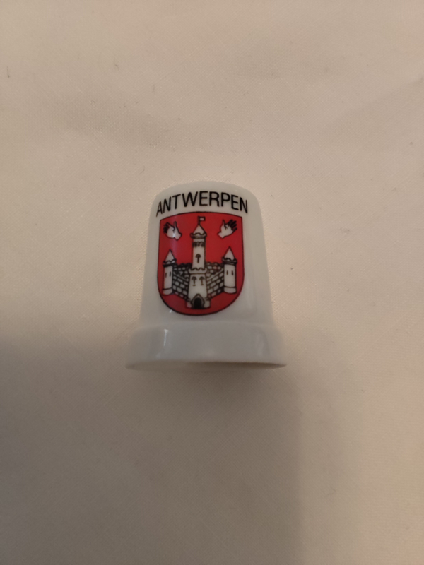 Vingerhoed porcelein opdruk Antwerpen 3cm hoog zonder doosjeOud porceleinen (fine Bone China) vingerhoed, opdruk of opschrift Antwerpen en geen inscriptie. De maat is 3cm hoog en de diameter is 2,5cm.