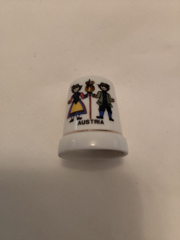 Vingerhoed porcelein opdruk Austria 2-zijdig 2,8cm hoog zonder doosjeOud porceleinen (fine Bone China) vingerhoed, opdruk of opschrift Austria aan beide kanten en geen inscriptie. De maat is 2,8cm hoog en de diameter is 2,4cm.