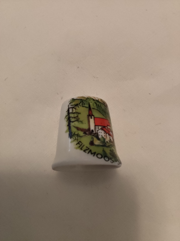 Vingerhoed porcelein opdruk Filzmoos Salzburg 2,8cm hoog zonder doosjeOud porceleinen (fine Bone China) vingerhoed, opdruk of opschrift Filzmoos Salzburg en geen inscriptie. De maat is 2,8cm hoog en de diameter is 2,4cm.