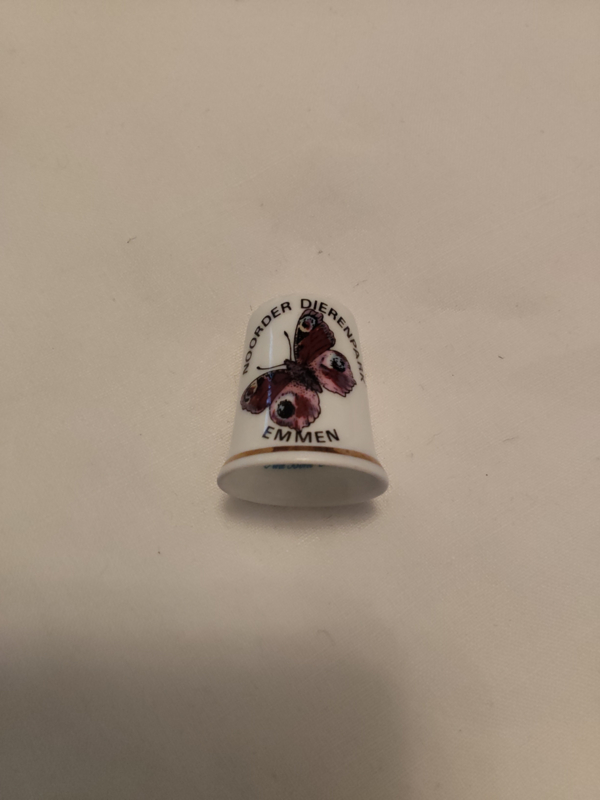 Vingerhoed porcelein opdruk Noorder Dierenpark Emmen 2,9cm hoog zonder doosjeOud porceleinen (fine Bone China) vingerhoed, opdruk of opschrift Noorder Dierenpark Emmen en inscriptie Fine Bone China. De maat is 2,9cm hoog en de diameter is 2,4cm.