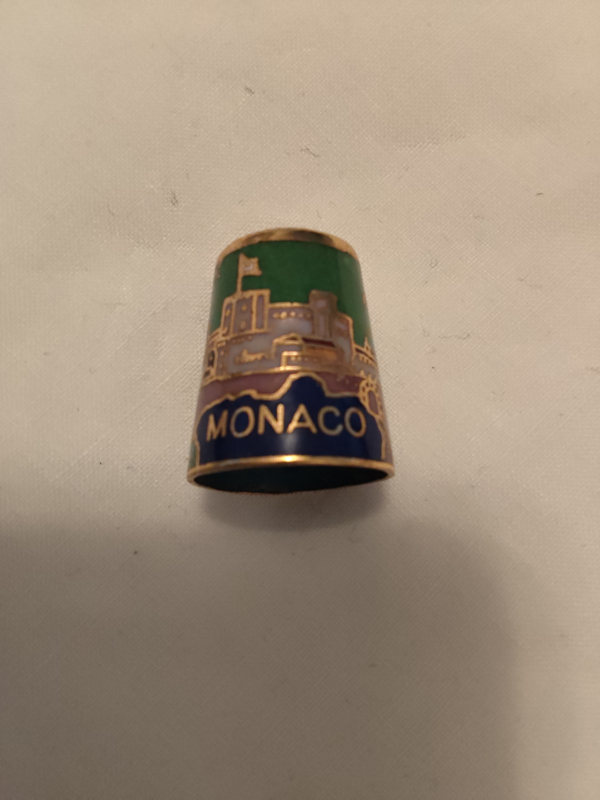 Vingerhoed metaal opdruk Monaco rondom opdruk 2,5cm hoog zonder doosjeOud vingerhoedje metaal, opdruk of opschrift Monaco rondom opdruk en geen inscriptie. De maat is 2,5cm hoog en de diameter is 2cm.