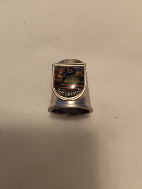 Vingerhoed metaal opdruk Schokland op wapenschild 2,6cm hoog zonder doosjeOud vingerhoedje metaal, opdruk of opschrift Schokland op wapenschild en geen inscriptie. De maat is 2,6cm hoog en de diameter is 2,2cm.